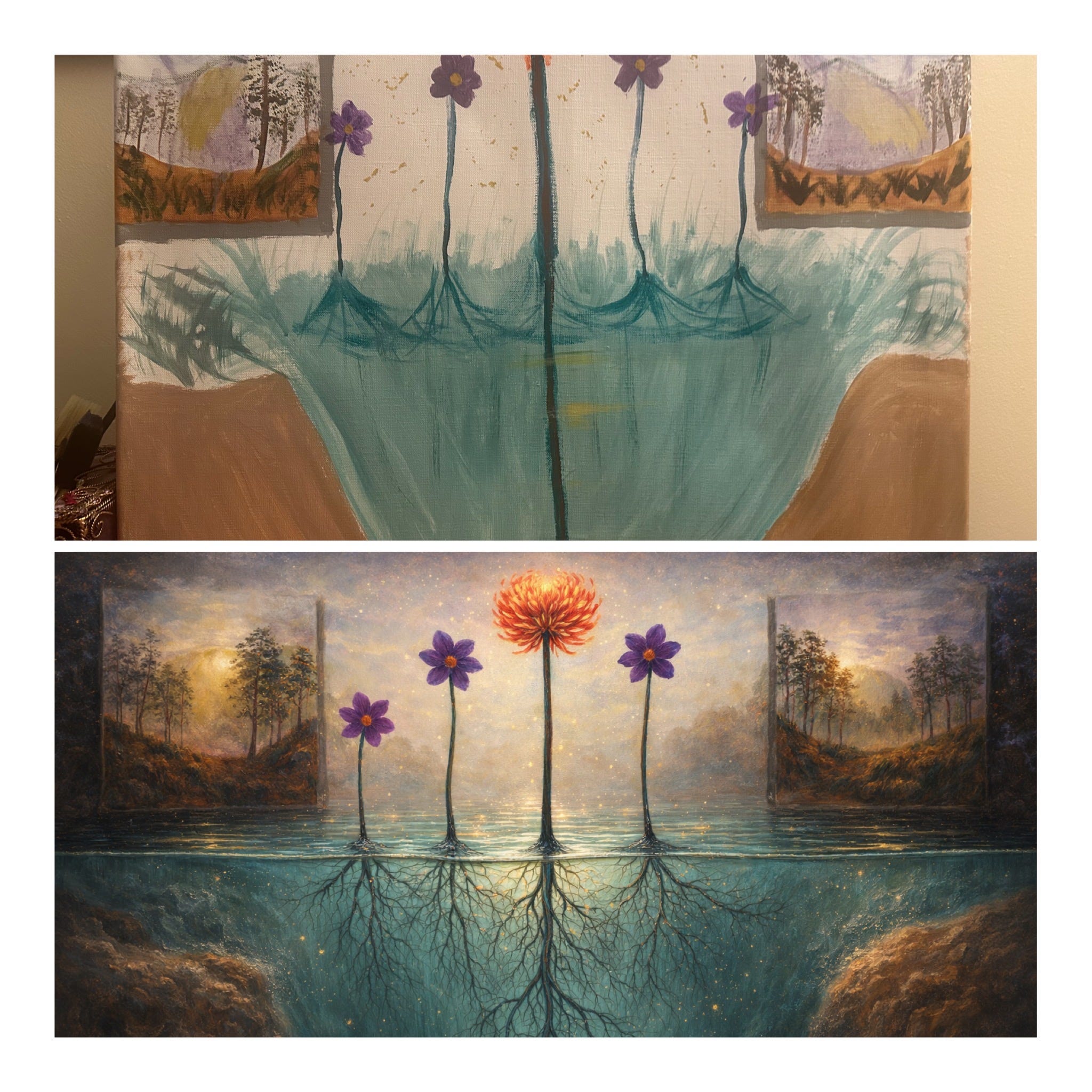 The top one is my original painting. Imperfect. A little uneven. Fully mine. Beneath it is the AI rendition imagined for me of I was a “real” artist.